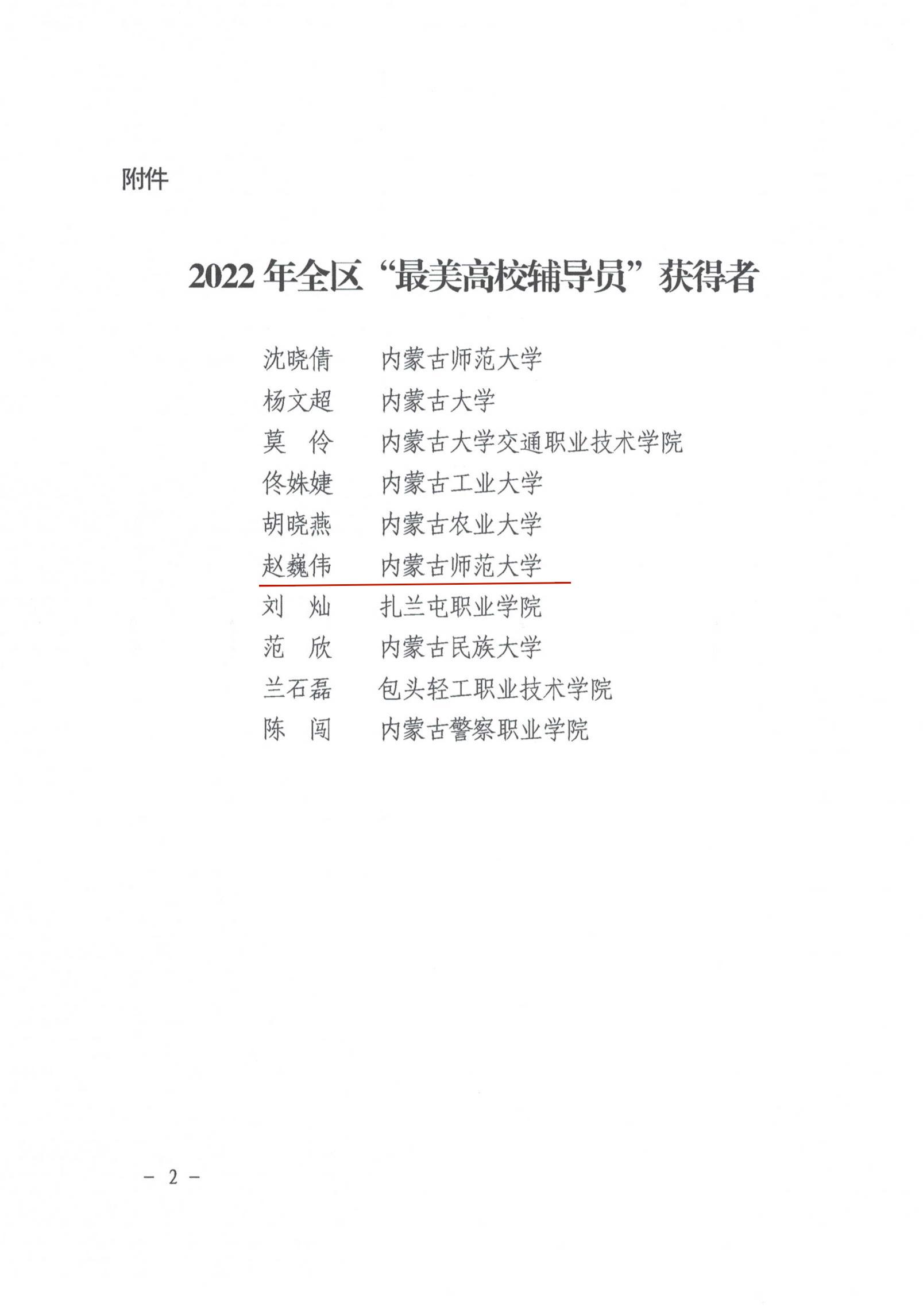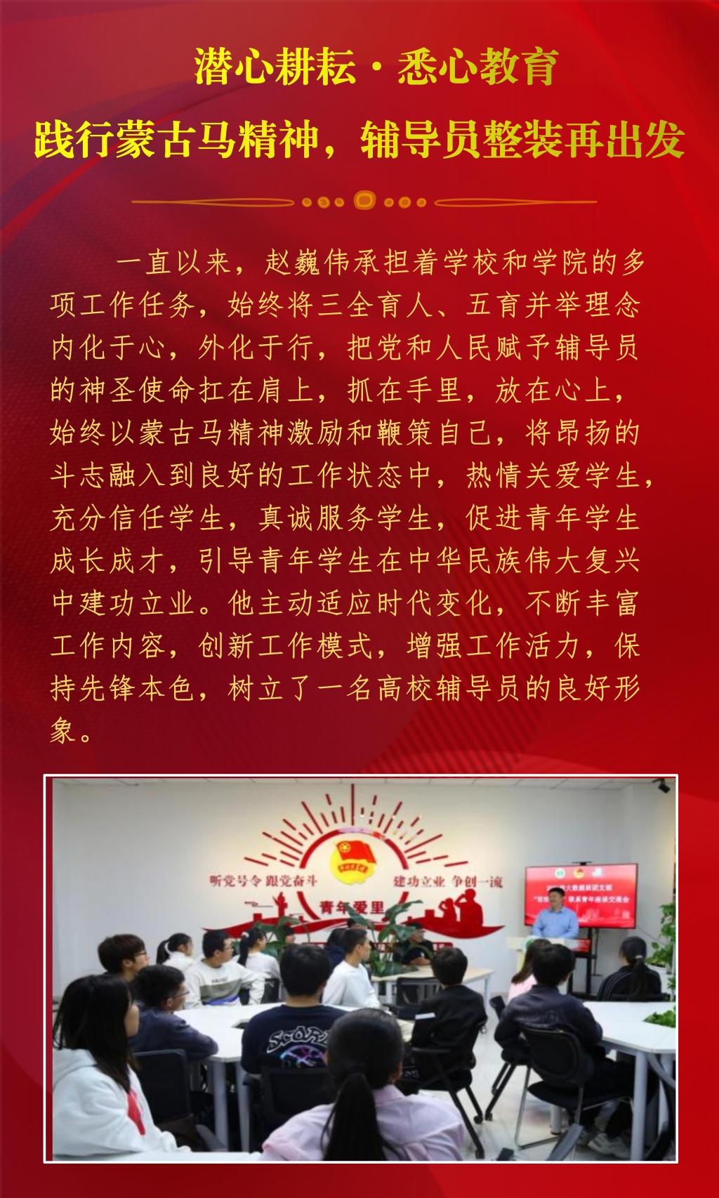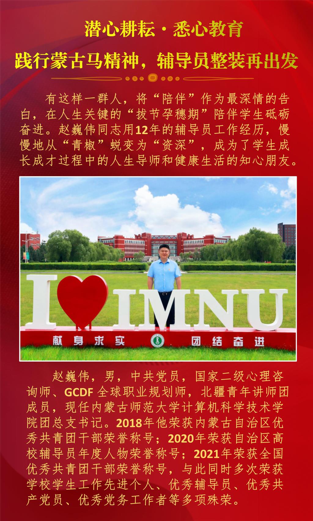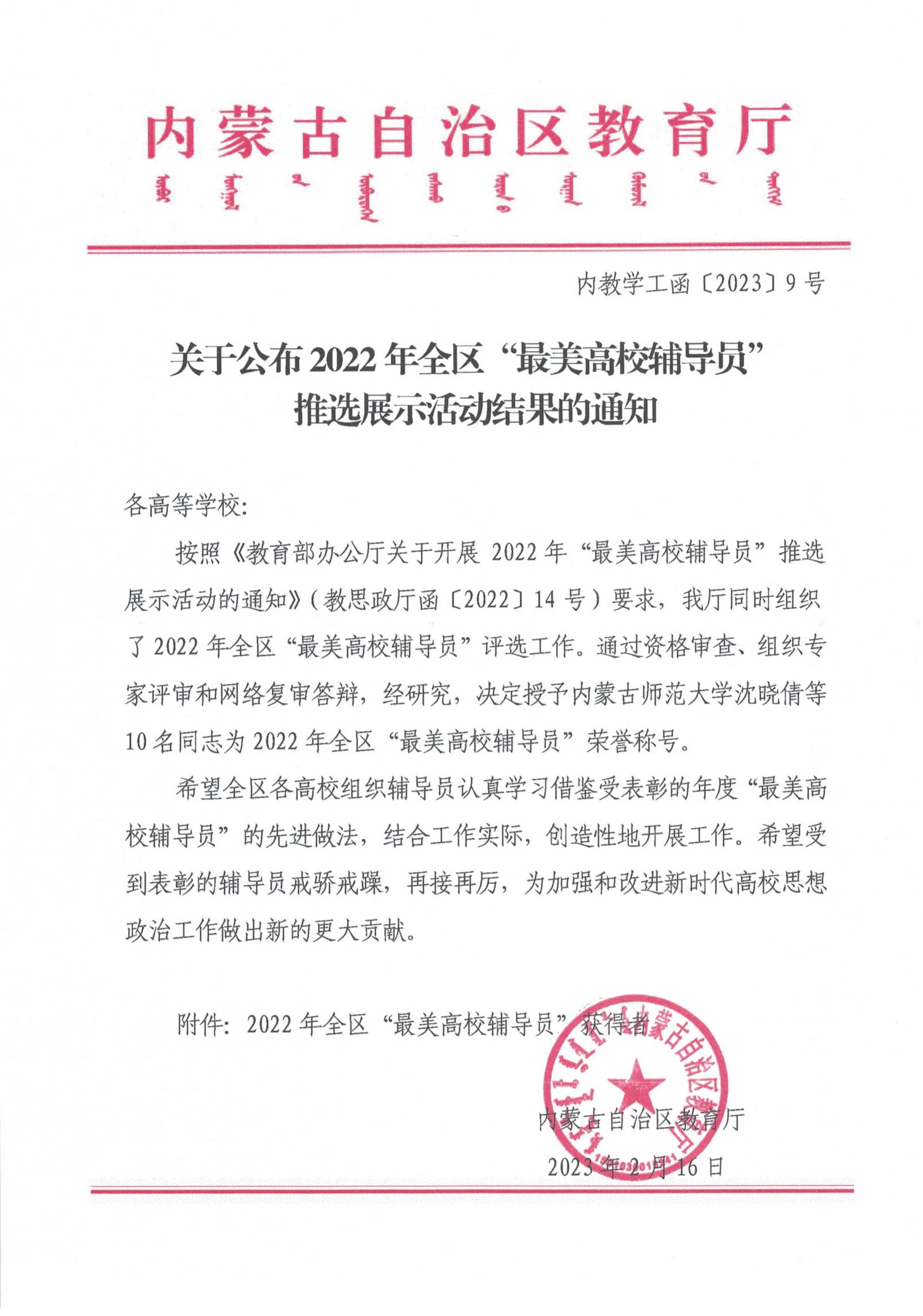 近日,内蒙古自治区教育厅公布了2022年全区最美高校辅导员推选展示活动的结果,经过资格审查、组织专家评审和网络复审答辩,授予10名辅导员“2022年全区最美高校辅导员荣誉称号”。今年会官网辅导员赵巍伟获此项荣誉。