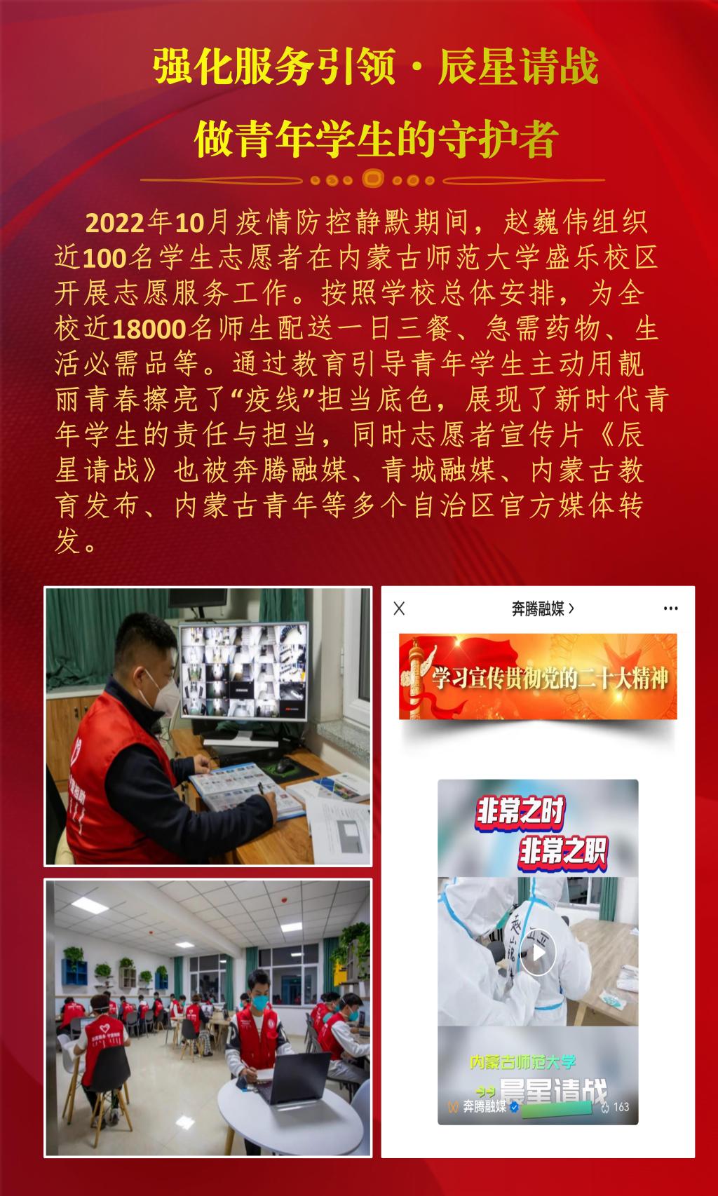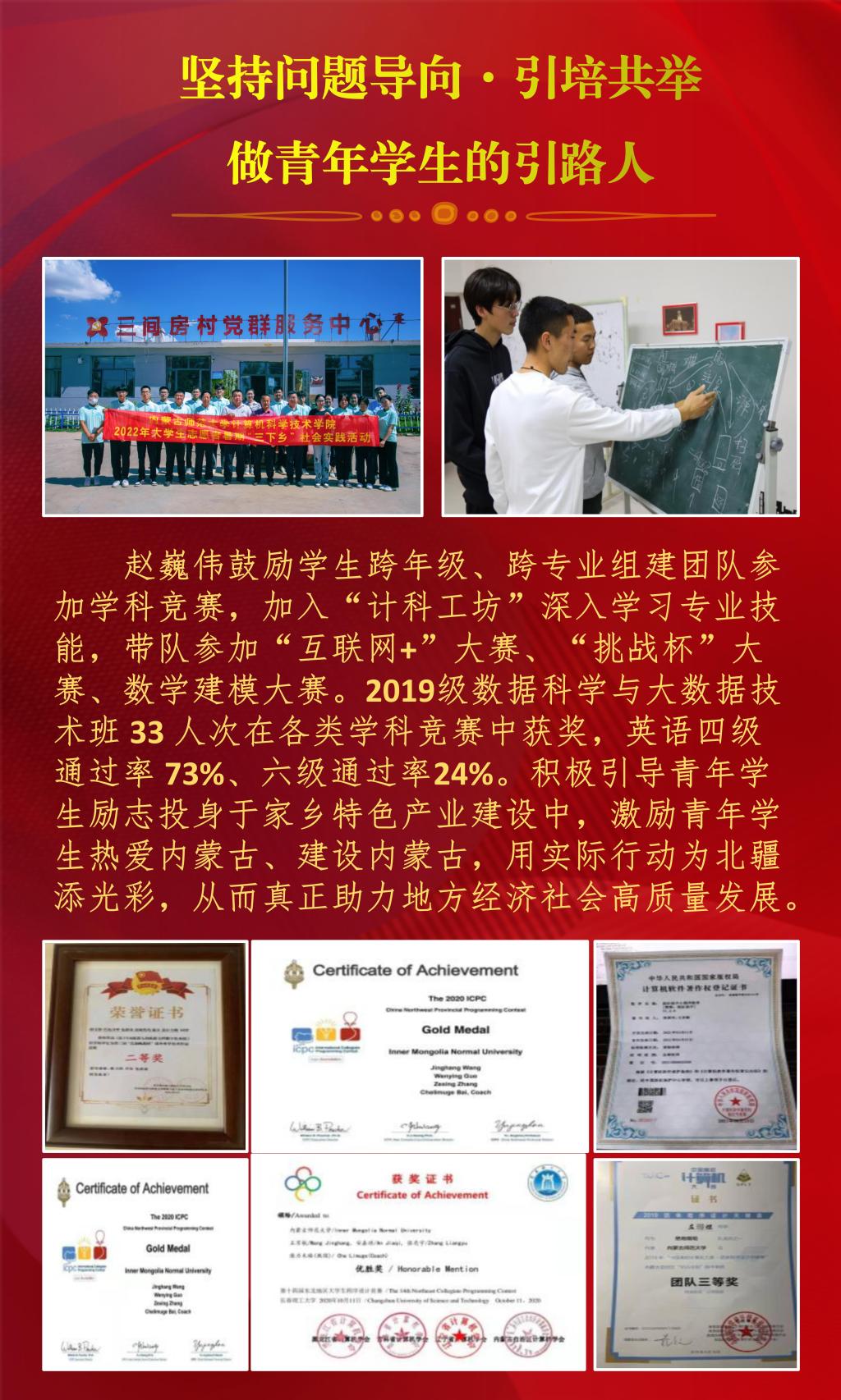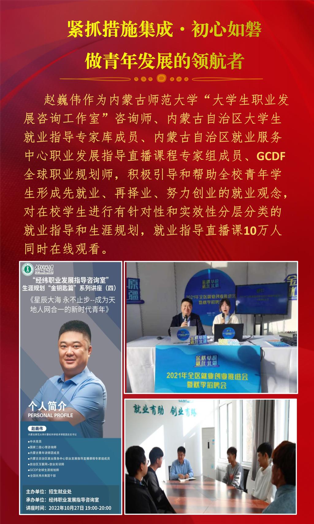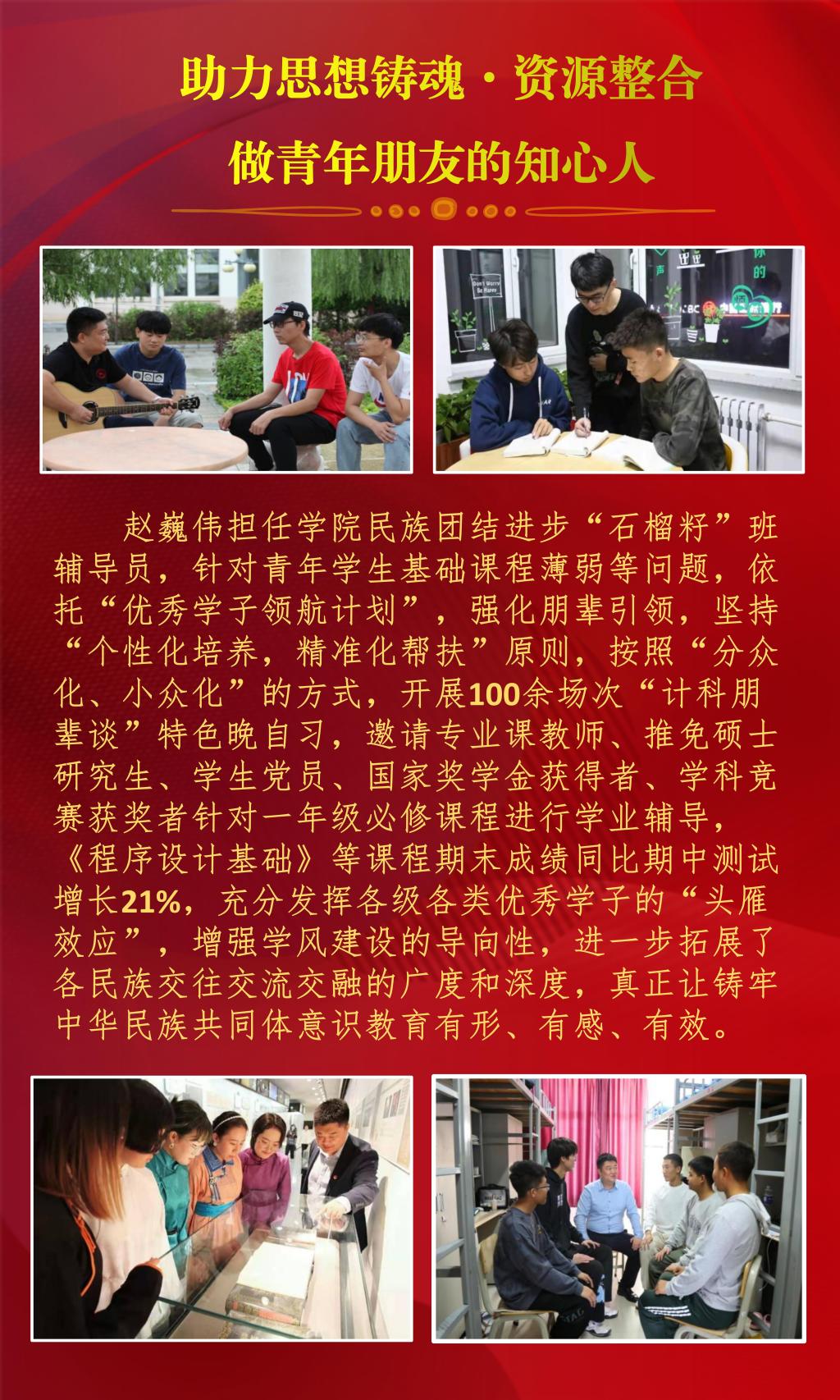 近日,内蒙古自治区教育厅公布了2022年全区最美高校辅导员推选展示活动的结果,经过资格审查、组织专家评审和网络复审答辩,授予10名辅导员“2022年全区最美高校辅导员荣誉称号”。今年会官网辅导员赵巍伟获此项荣誉。