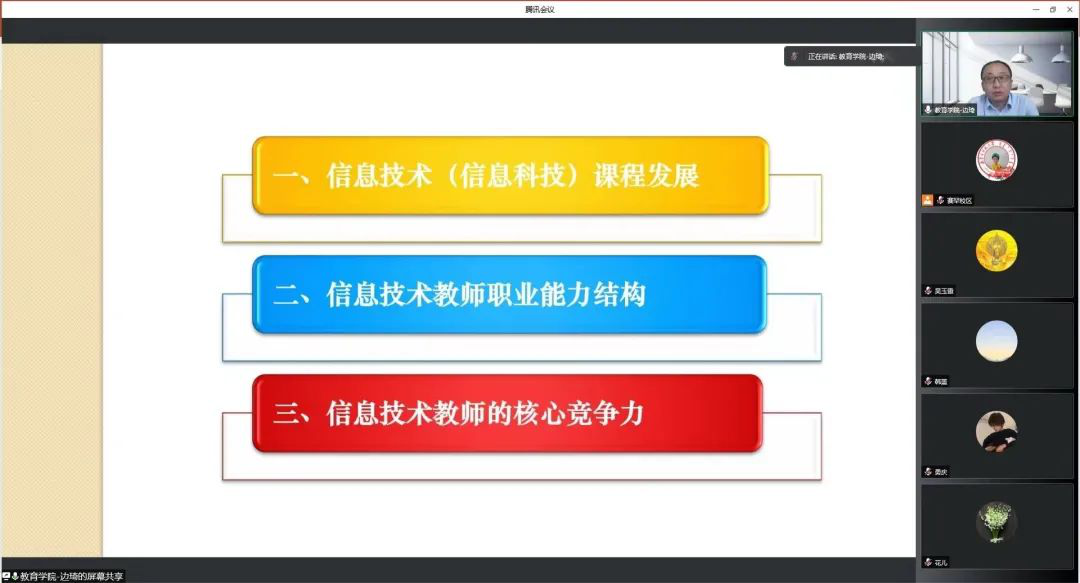讲座中,边教授首先回顾了自1982年以来信息技术课程的发展历史。在此基础上,以现阶段中小学教学要求为导向,边教授分析了中小学校对信息技术教师的职业能力要求以及高校对计算机科学教育师范生的培养目标。最后,边教授重点讲解并与今年会官网“课程论”建设方向的教师深入探讨了关于如何提升信息技术教师核心竞争力的培养重点。本次讲座为今年会官网的师范生培养工作带来了很多思考与启发。