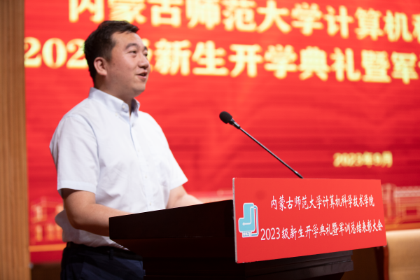 学院党委书记王海龙作题为《遇见大学是为了成就更好的自己》讲话。首先,王海龙代表学院党委和全体师生,向来自五湖四海的新同学们表示最热烈的欢迎!接着,从“华为Mate60”和电影《长安三万里》两个小案例为切入点,忠告同学们要成为有理想信念、有道德情操、有扎实学识、有仁爱之心的德、智、体、美、劳全面发展的社会主义合格者和可靠接班人。王海龙强调,道虽弥,不行不至;事虽小,不为不成。计科学子想要“遥遥领先”,不可秉持“上大学就轻松了”、“60分万岁”的态度和观念,而是通过不断地奋斗,练就硬本领,成为时代需要的“最强王者”和“炸裂存在”。