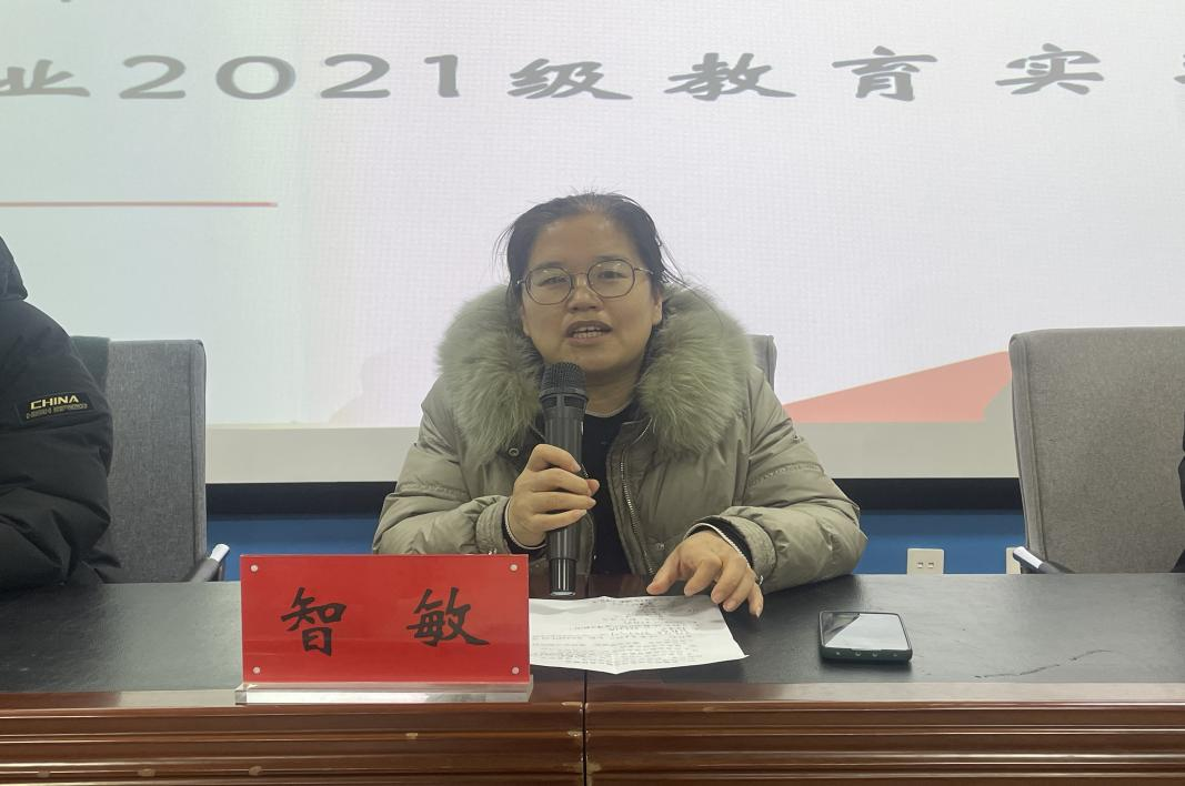 智敏副院长做教育实习动员讲话,她对实习的同学们提出三点要求。第一,做好本学期离校和假期准备工作;第二,严格遵守实习单位的规章制度,尊重师长,团结同学,积极参与实习工作;第三,注意安全,遵守交通规则,确保实习期间的人身安全,财产安全。