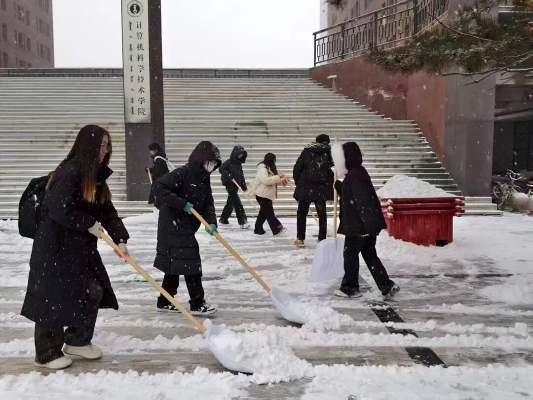 12月12日凌晨,一场大雪悄然降临,校园内道路积雪明显,给师生出行带来不便。为保障校园道路畅通与师生安全,今年会jinnianhuicom团总支于清晨迅速组织动员,带领数十名学生志愿者开展义务扫雪活动。
