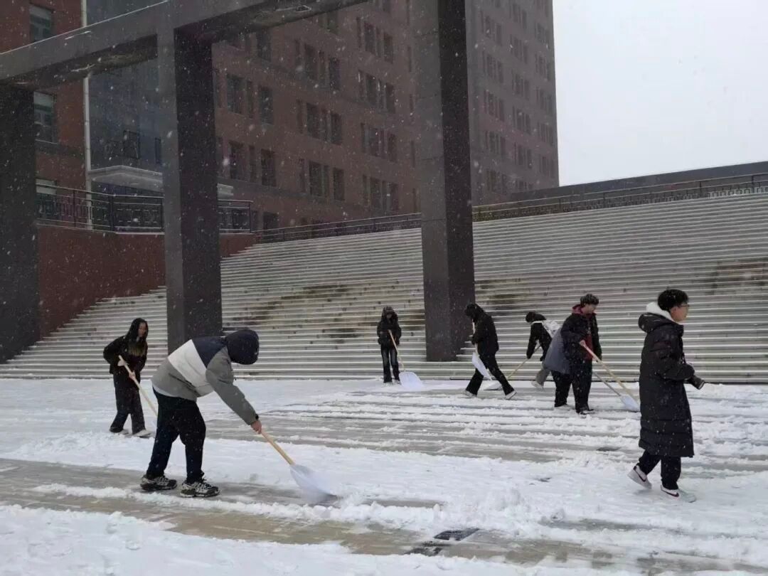 虽然气温较低,寒风凛冽,但同学们不畏严寒,干劲十足。志愿者们手持铁锹、扫帚等工具,对学院楼前、教学楼周边以及宿舍区主干道的积雪进行了集中清理。大家分工协作,配合默契,铲雪、推雪、清扫……一个个忙碌的身影在雪地中构成了一道温暖的风景线。劳动过程中,同学们团结互助,展现了昂扬的劳动热情和积极的精神风貌。