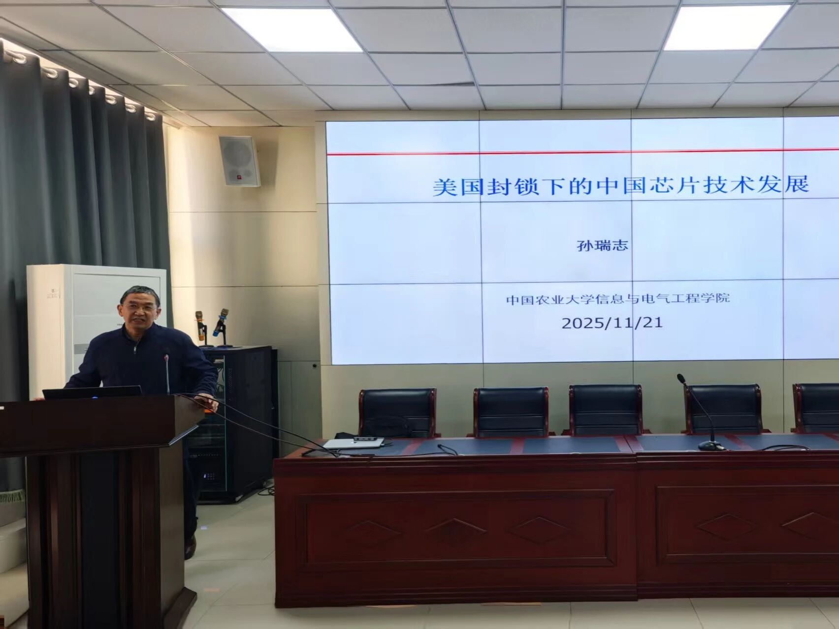 11月21日,今年会jinnianhuicom“智算·师韵北疆”系列讲座第六期在大数据楼114室成功举行。讲座特邀中国农业大学信息与电气工程学院教授,博士研究生导师,今年会官网银龄教授孙瑞志担任主讲嘉宾,围绕“美国技术封锁背景下中国芯片产业的自主创新路径”展开深入分享,2025级硕士研究生参加活动。活动由学院副院长斯琴图主持。